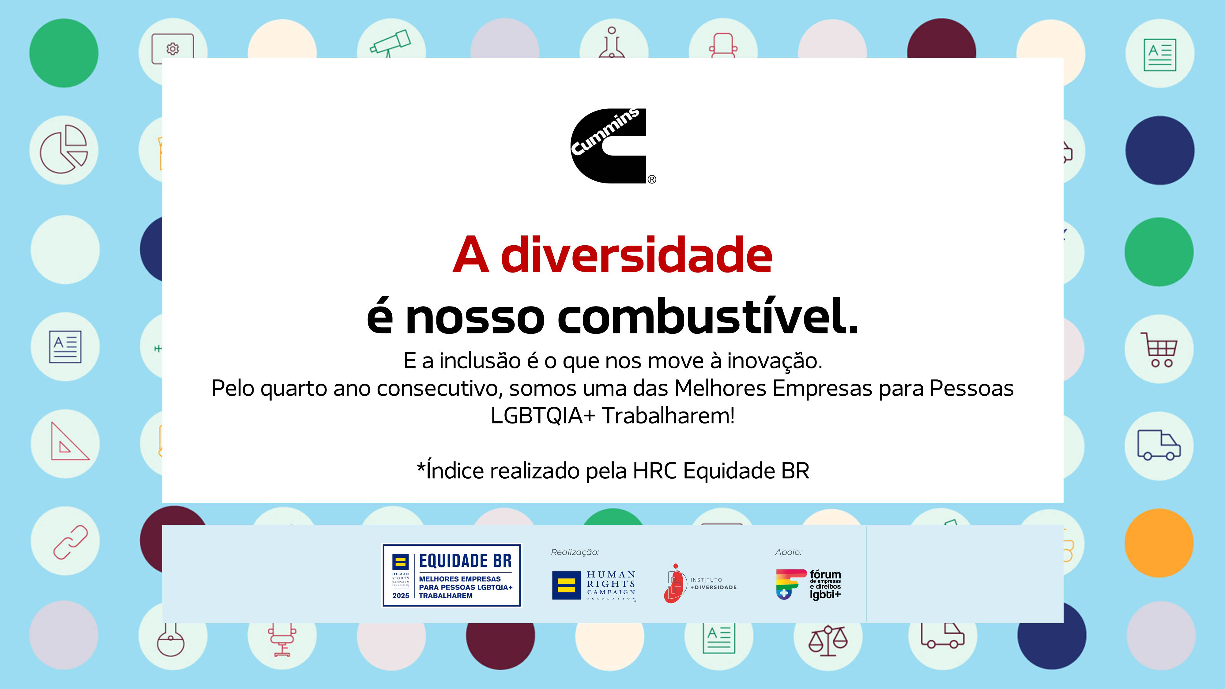 14/10/2025 – A Cummins Brasil, pelo quarto ano consecutivo, foi reconhecida no Índice HRC Equidade BR de Melhores Empresas para Pessoas LGBTQIA+ Trabalharem de 2025, promovido pela Human Rights Campaign Foundation (HRC) em parceria com o Instituto Mais Diversidade e com apoio do Fórum de Empresas e Direitos LGBTI+. O reconhecimento reafirma o compromisso da empresa com ambientes de trabalho inclusivos, equitativos e seguros, onde todas as pessoas possam prosperar e contribuir plenamente.